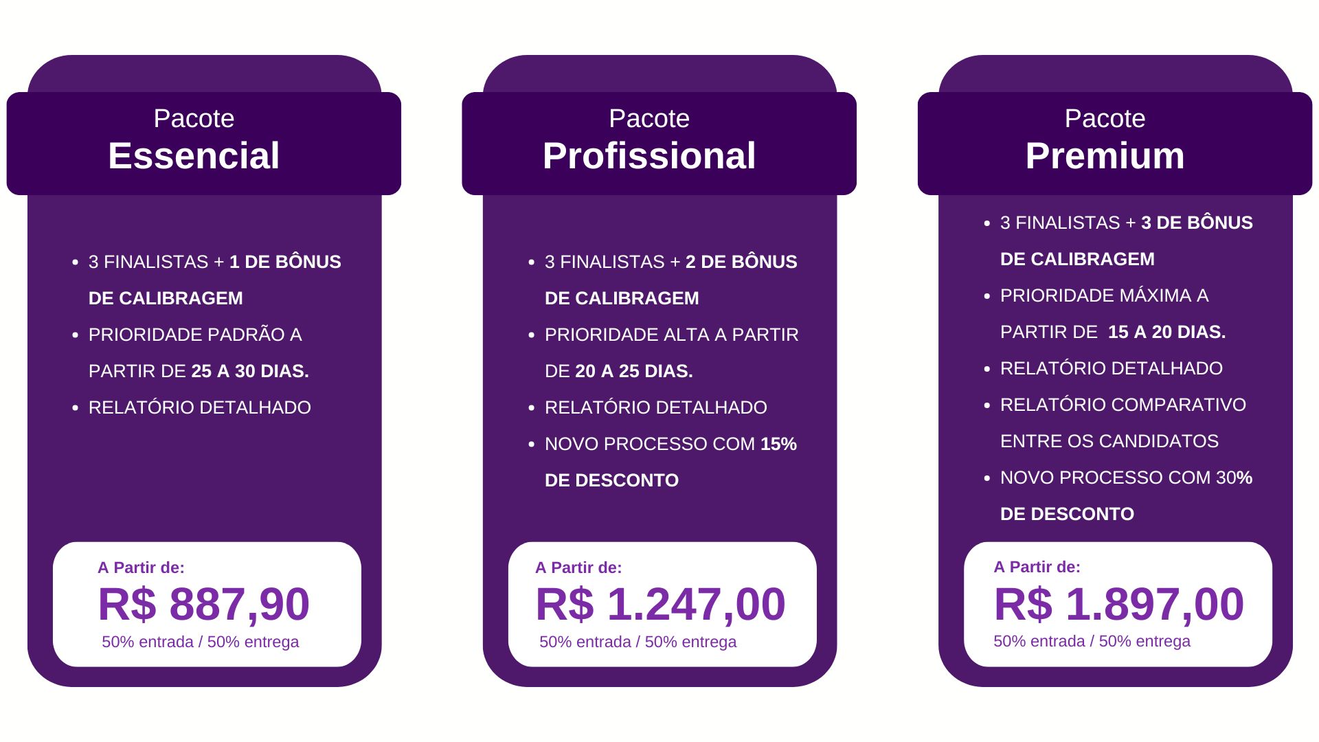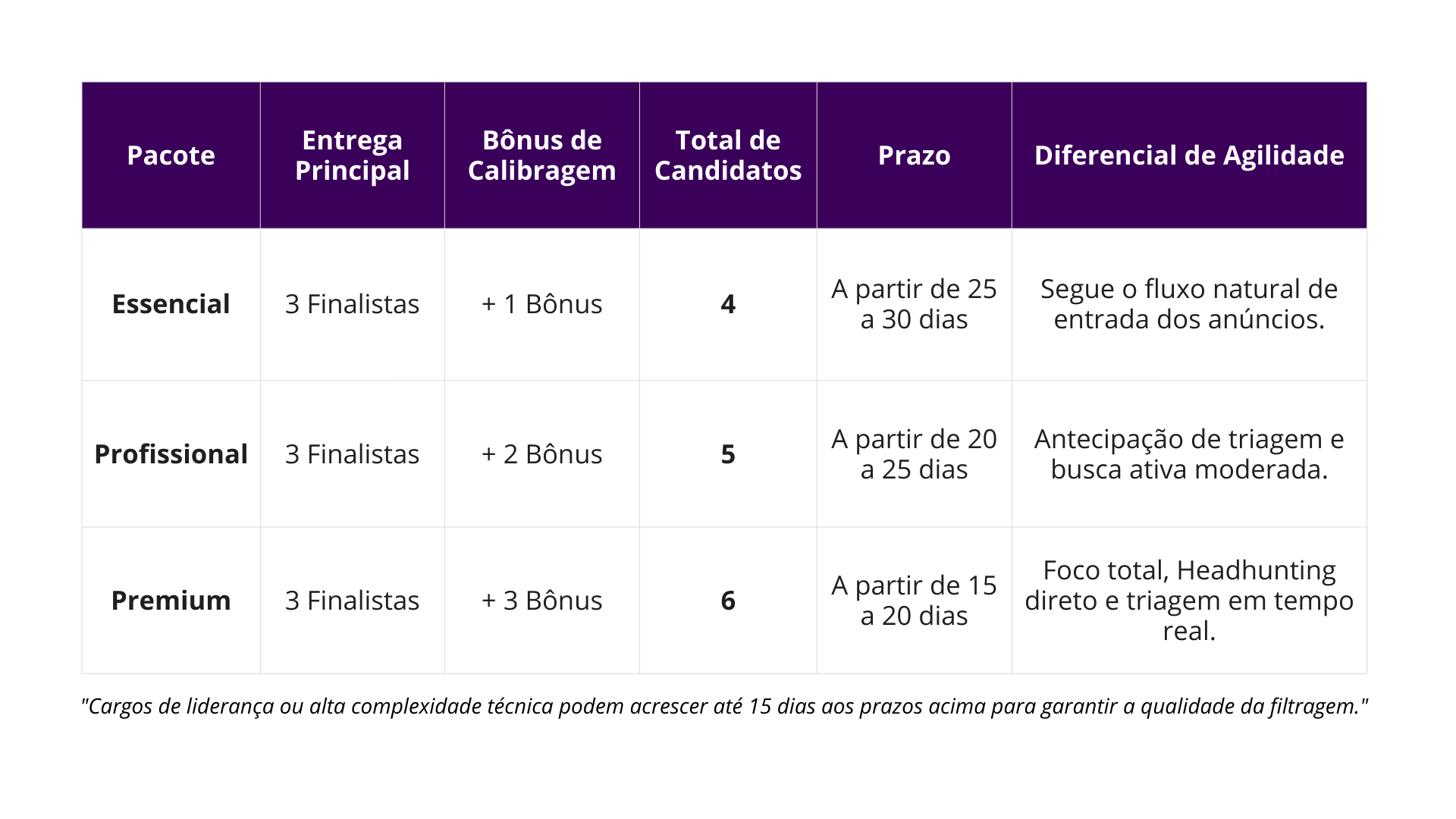 Além de todas as etapas do Pacote Essencial, inclui entrevistas por competência, avaliação comportamental, análise de aderência ao perfil da vaga e suporte consultivo na etapa final de decisão.